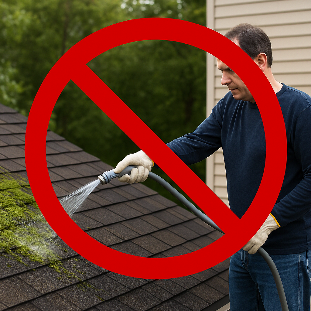 We get it—it’s tempting. But pressure washing can strip the protective granules from asphalt shingles and void manufacturer warranties. It also forces water up under the shingles, exactly where we don’t want it.